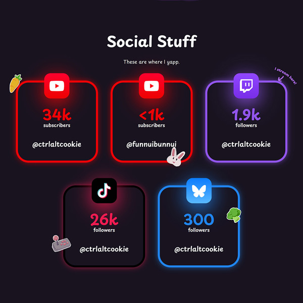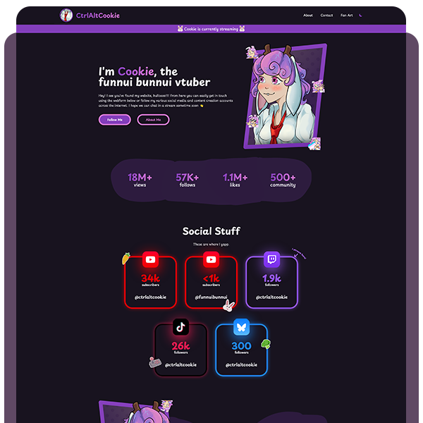 This website for Cookie is a hub for all of her content, social media and contact information. It shows stats and links from all of the platforms she is on, as well as a banner which appears when she is live on Twitch. There's also a page dedicated to fan art, which is pulled directly from Bluesky.