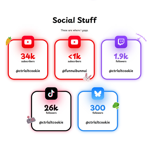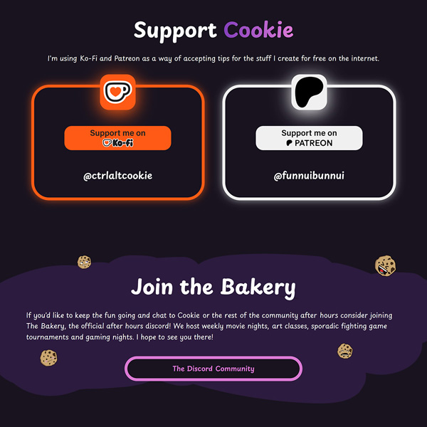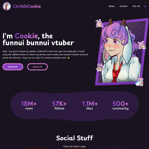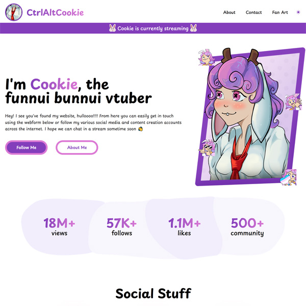 This website for Cookie is a hub for all of her content, social media and contact information. It shows stats and links from all of the platforms she is on, as well as a banner which appears when she is live on Twitch. There's also a page dedicated to fan art, which is pulled directly from Bluesky.
