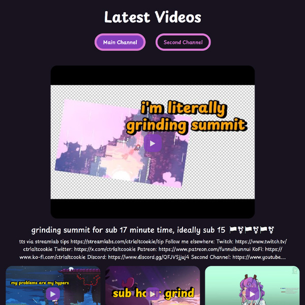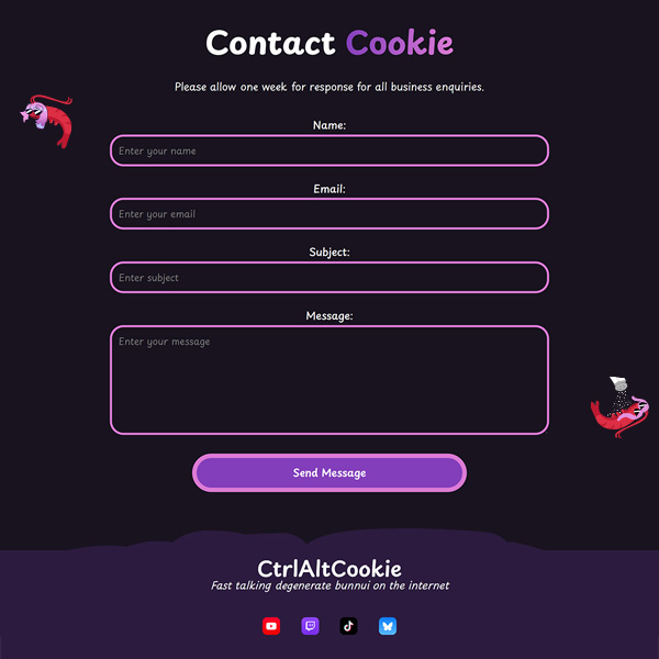 This site was designed to showcase all of Cookie's online content. As she is a content creator, it is highly beneficial to have a landing page where an audience can find all of the information they need in one place. The site contains information about Cookie, her social media stats, where to find her online, how to join the discord community, and how to contact her for business enqueries. It also utilises both the Twitch and Youtube API's to grab data from those websites to show when she's streaming on Twitch as well as dispaly the most recent few videos she has uploaded on Youtube. As these are her most active areas, it is important to have dynamic and up to date content.