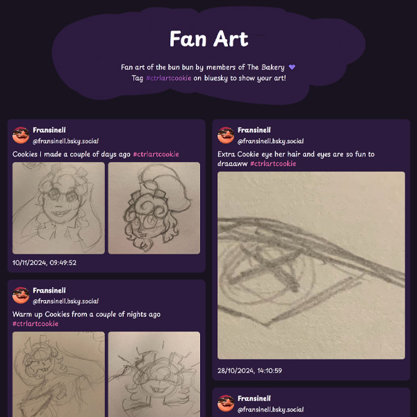 Additionally, there's a second page that is dedicated to fan art which her community likes to draw. These images are all grabbed automatically from Bluesky using their public API, grabbing all posts with images from the hashtag 'CtrlArtCookie'.